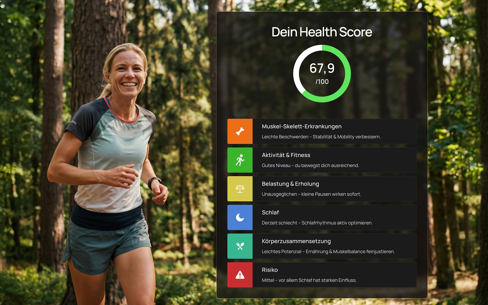 Über unsere Online-Plattform können Mitarbeitende einfach und zeitsparend ihren Gesundheitsstatus bewerten. Das Ergebnis ist ein persönlicher Health Score, der erste Anhaltspunkte zu Bewegungsverhalten, Belastung und Wohlbefinden liefert.